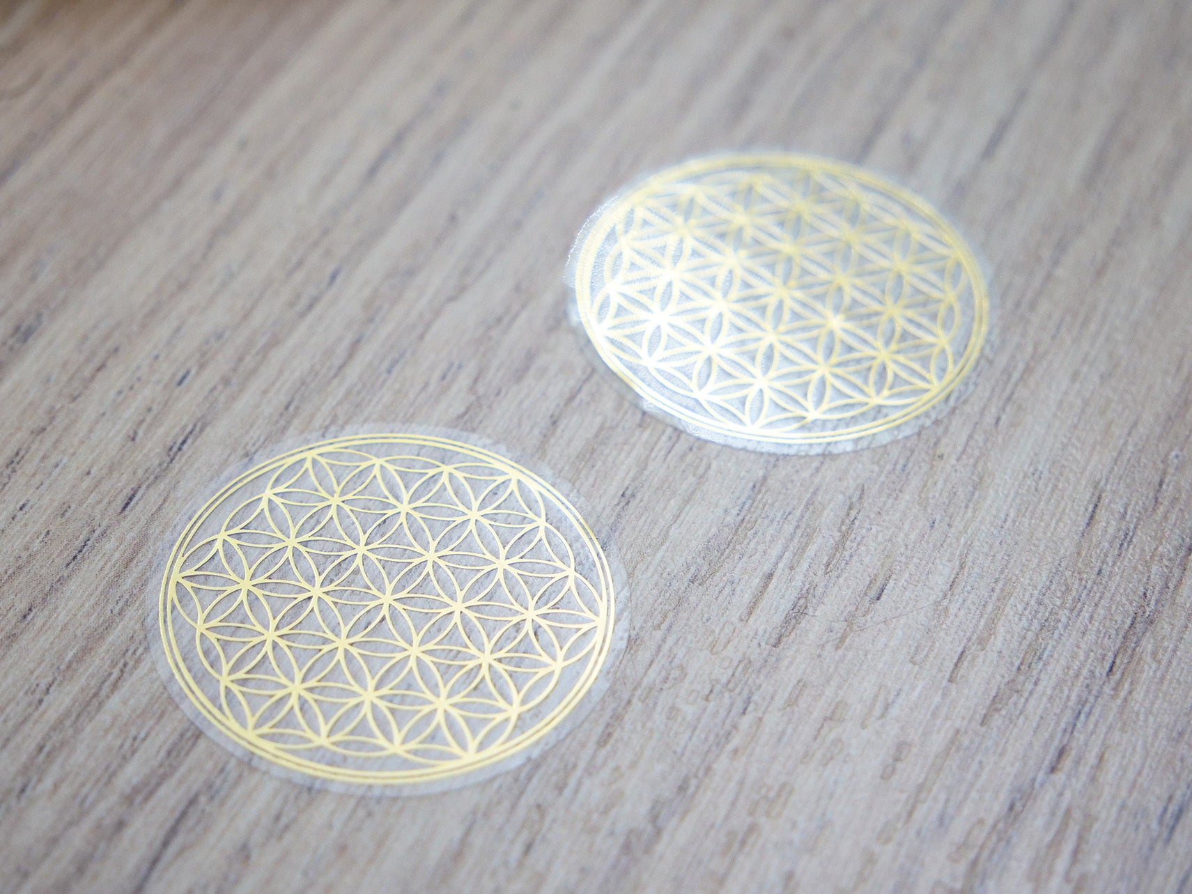 Autocollant fleur de vie doré avec fond transparent. Pour coller sur une fenêtre, un meuble, ou ailleurs !ø 2,7cm