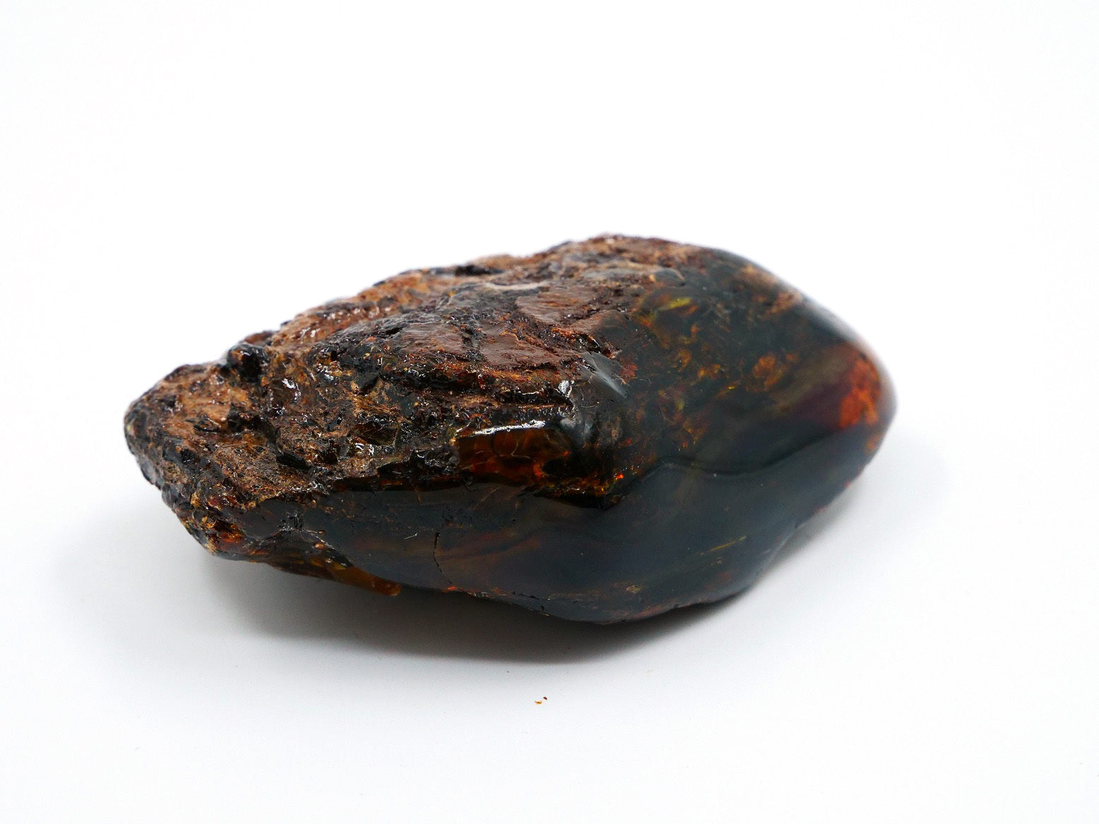 Dimensions approximatives: 7,5 x 5 x 2 cmL'ambre bleu, principalement trouvé en République dominicaine, Indonésie et Mexique, doit sa couleur à une fluorescence stimulée par la lumière ultraviolette. Le phénomène est dû aux hydrocarbures, probablement le perylène, présents dans l'ambre. Seuls certains ambres, originaires de l'arbre Hymenaea protera, peuvent présenter ce phénomène.