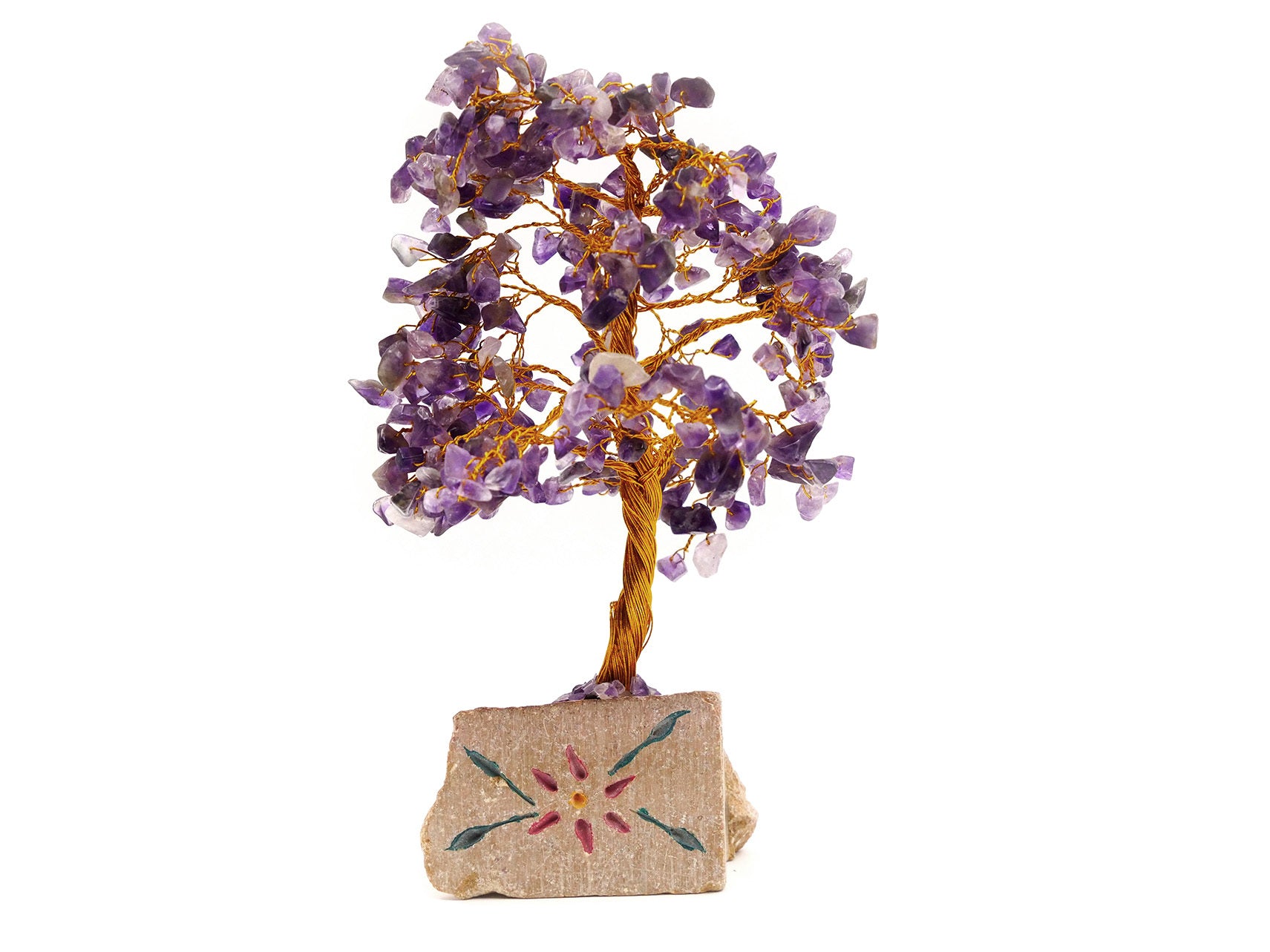Ces arbres de pierres semi-précieuses sont fabriqués en Inde. Ils sont fabriqués à la main à partir de véritables pierres semi-précieuses montées sur un support en pierre.Chaque produit étant unique, les dimensions et la base en pierre peuvent varier.320 pierres Hauteur: 240mm