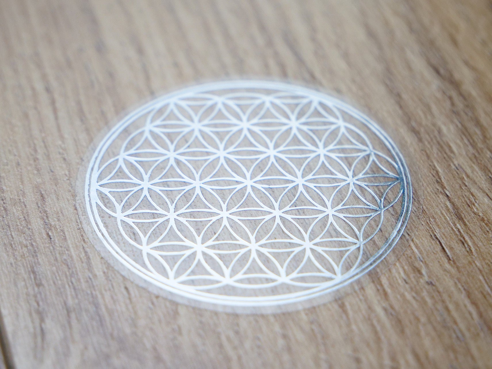 Autocollant fleur de vie argenté avec fond transparent. Pour coller sur une fenêtre, un meuble, ou ailleurs !ø 4,5cm