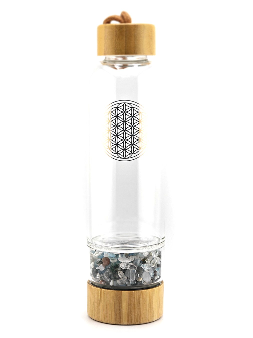 La Bouteille allergies & stress associe les bienfaits du cristal de roche, de l'aigue-marine et de l'agate mousse.