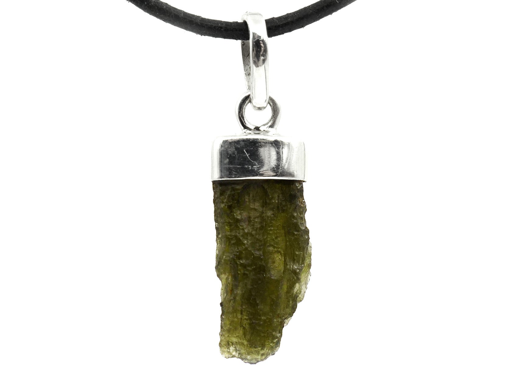 Pendentif en moldavite brute et bélière en argent 925.La moldavite est une forme de tectite, résultant de l'impact d'une météorite avec la Terre il y a environ 15 millions d'années. Elle est surtout connue pour sa couleur verte distincte et est souvent utilisée en joaillerie. On la trouve principalement en République tchèque.