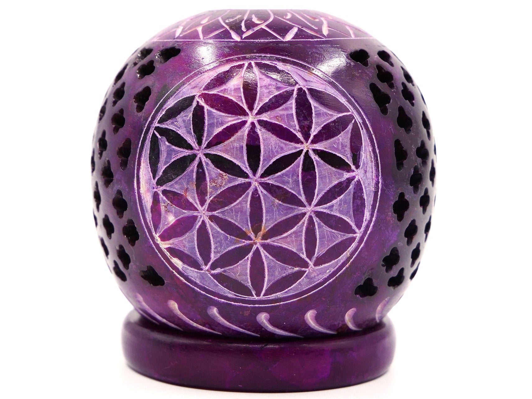 Ajoutez une atmosphère douce et spirituelle à votre espace avec ce photophore Fleur de Vie de couleur lila. Finement sculpté dans la stéatite, ce photophore est décoré avec le symbole sacré de la Fleur de Vie et comporte des trous qui laissent passer de délicates lueurs. Allumez une bougie à l'intérieur et laissez ces douces lumières apporter calme et sérénité à votre intérieur.